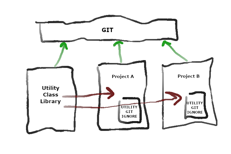 NOTE: If you have a large library or are avoiding multiple copies, another approach would be to have the developer of the consuming project check out a branch of the utility solution. They can then link this as an existing project (as it sits on their machine), adjust the GIT ignore on each of these projects, and now they only have one copy of the utility class for all of their projects. Additionally, changes they make to their copy are only propagated through GIT controls.