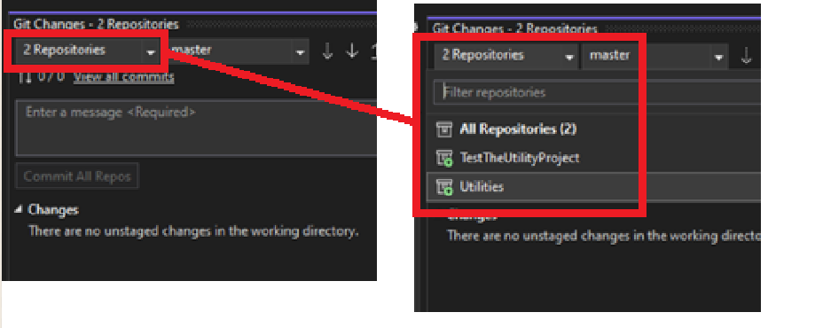 GIT submodules give a us a better way of dealing with this. A submodule allows us to add a reference to another repository for re-use while allowing that submodule to maintain its separate version history. Although we can't directly set this up in Visual Studio, it does respect the submodule and give us ways to work with them. The benefit here is that consuming projects can debug and make updates to the utility class in the scope of their consuming project. They can push these changes to the repository branches of the utility class for versioning control (pulls and conflict resolution are along for the ride). The drawback is that now there are multiple copies of the utility project out there potentially using large amounts of data. In a distributed multi-developer scenario this is probably less of a concern, but if a developer has several consuming projects or the library is large you should look at a hybrid approach - (the following note's for you).