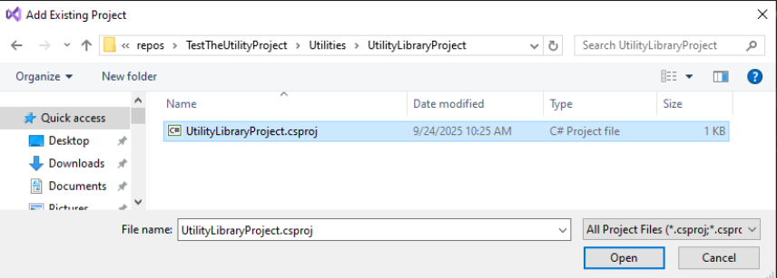Another way to skin this cat is to add a linked existing project to your consuming solution. The benefit is that now your consuming projects can troubleshoot/debug the utility class within their realm more easily. The double edged sword here is access. You can make changes in the utility project and they will automatically be seen in the consuming solutions (they are looking at the same code). In a multi-user environment this is bad as other users would need access to the files and could make unmanaged changes to the utility class code base. What happens if you are making changes as someone else is debugging or publishing? Additionally, without adjusting the solution scoped git ignore in Visual Studio, you will end up with duplicated commits in your GIT repository.