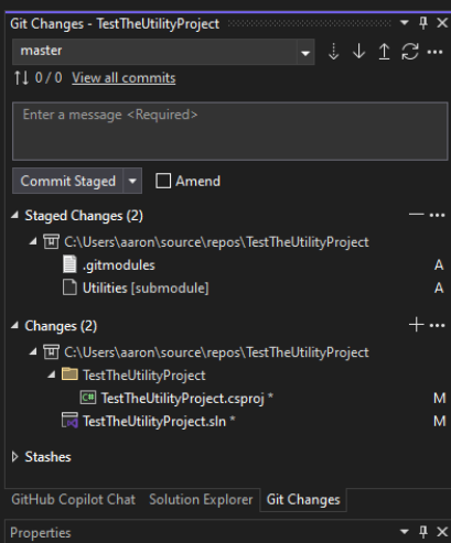 If we now flip over to the Git changes tab, we will see that the submodule reference is part of our staged changes. We can push and commit this out to our repository. When it gets to our remote, there will just be a listing that shows theres a submodule link (it will not copy the code into the consuming project's repository).
